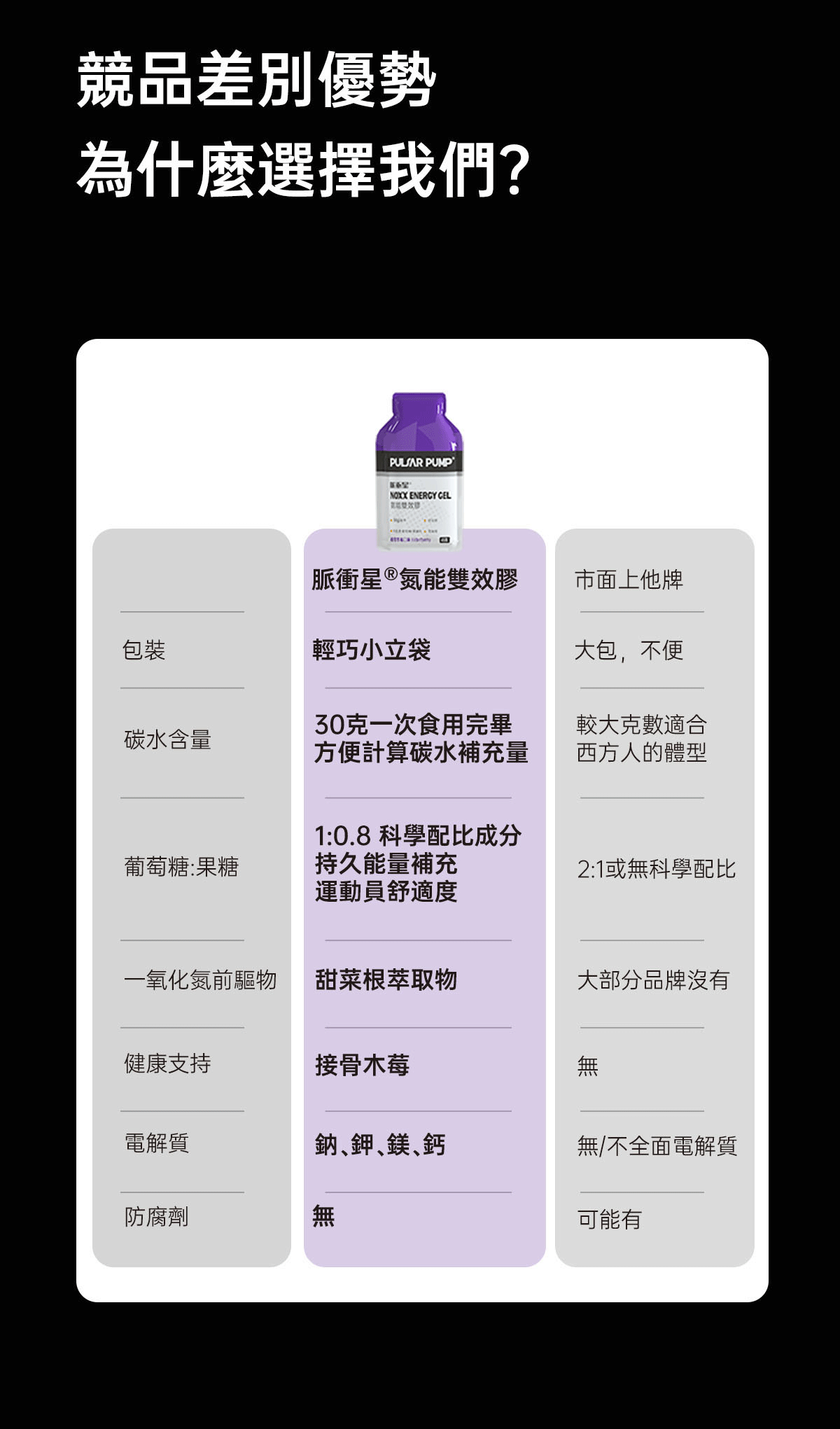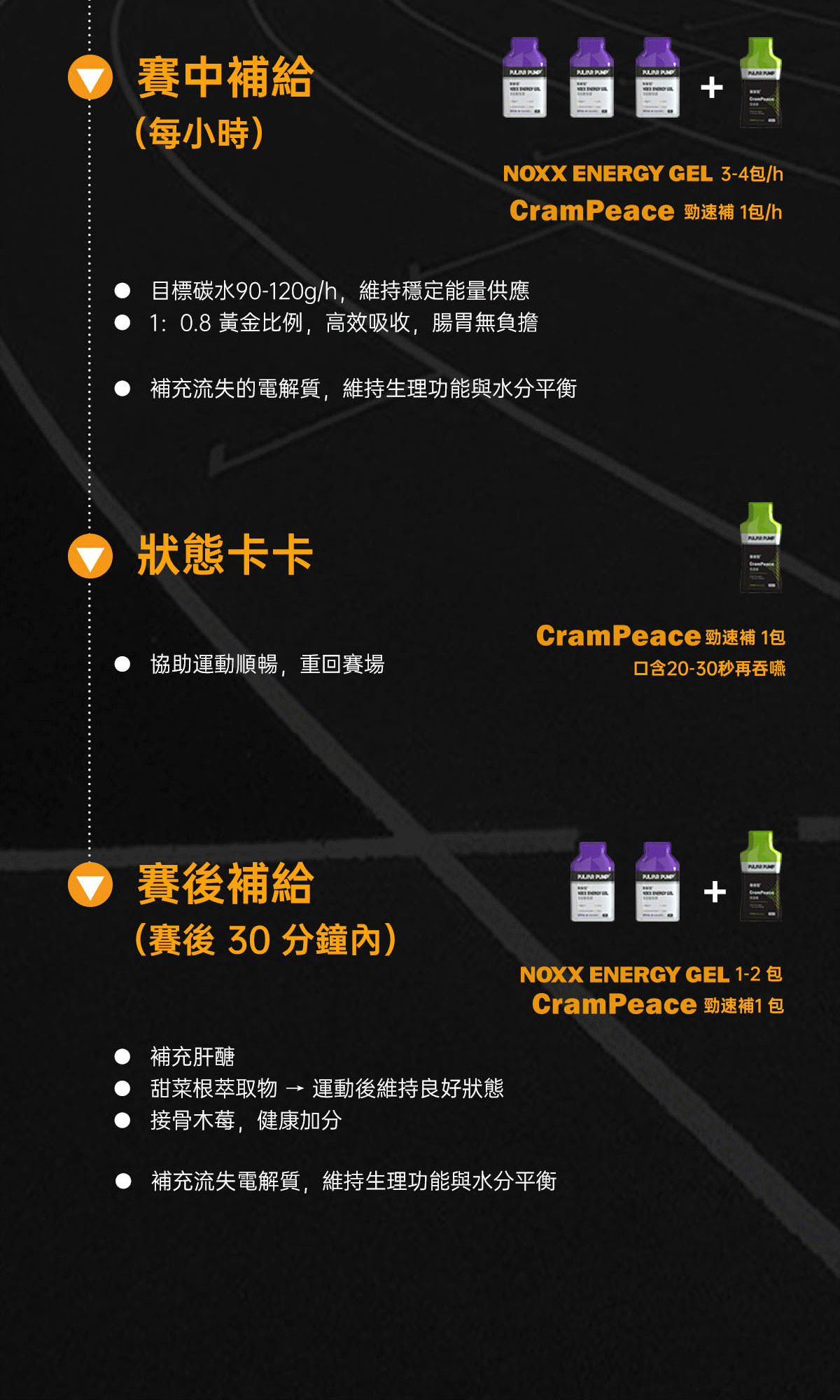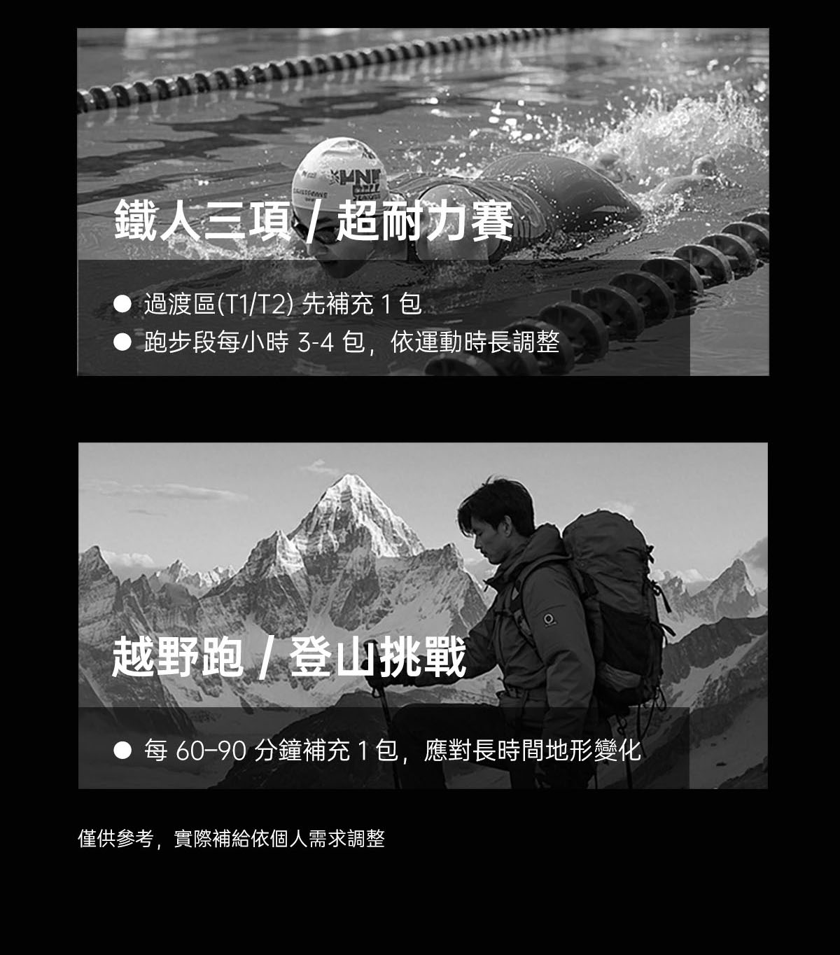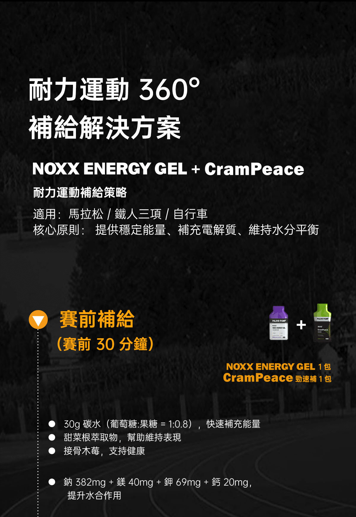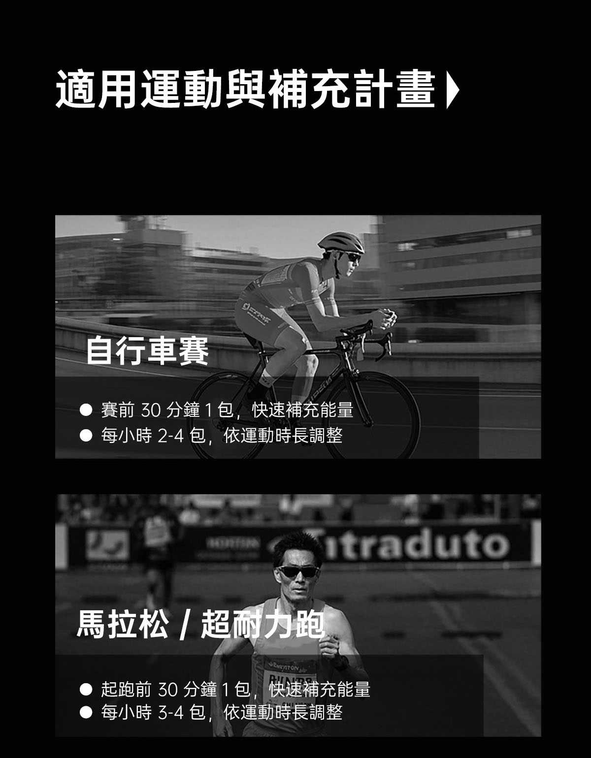 適合三鐵、自行車、馬拉松、越野跑等長時間的耐力運動,運動前30分鐘先1包,賽中每20~30分鐘1包。